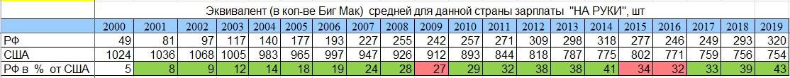 Динамика соотношения покупательной способности зарплат "на руки" в России и США за 20 лет
