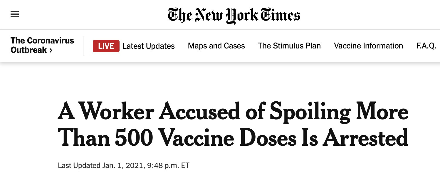Есть и другие случаи. Как пишет The New York Times, в штате Висконсин арестован фармацевт, обвиняемый в угрозе безопасности первой степени, фальсификации рецептурного лекарства и преступном причинении ущерба. На деле же просто вакцину из холодильника достал — и уже пришедшей в негодность привили 57 человек. Причём в статье NYT речь идёт о Moderna с куда более мягкими режимами хранения, нежели Pfizer, для которой даже в релизе Всемирной организации здравоохранения температурный диапазон обозначен как «-60 °C to -90 °C».