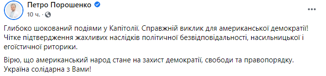 "Глубоко шокирован событиями в Капитолии. Настоящий вызов для американской демократии! Четкое подтверждение ужасных последствий политической безответственности, насильственной и эгоистической риторики. Верю, что американский народ встанет на защиту демократии, свободы и правопорядка. Украина солидарна с Вами!", - написал экс-президент.