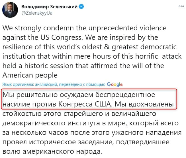На следующий день ситуацию оценил президент Владимир Зеленский. Он дождался, пока с осуждением захвата Конгресса выступят все мировые лидеры и затем спел с ними в унисон.