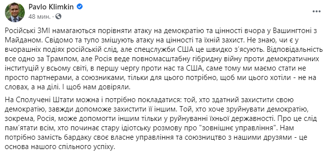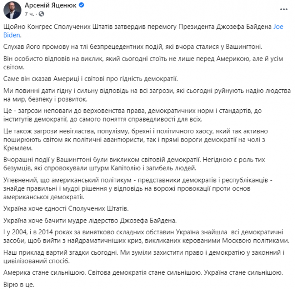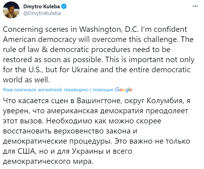"Вчерашние события в Вашингтоне были вызовом мировой демократии. Недостойной является роль тех безумцев, которые спровоцировали штурм Капитолия и гибель людей. Уверен, что американский политикум - представители демократов и республиканцев - найдет правильные и мудрые решения в ответ на враждебные провокации против основ американской демократии.