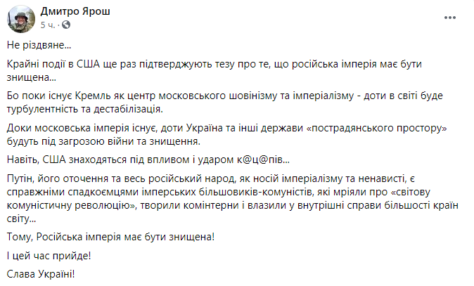 Дмитрий Ярош, к примеру, из событий в Конгрессе сделал парадоксальный вывод, что "Российская империя должна быть уничтожена". Он написал пост, в котором проходит мысль, что дестабилизировать Штаты вчера пытался "Путин, его окружение и весь русский народ".