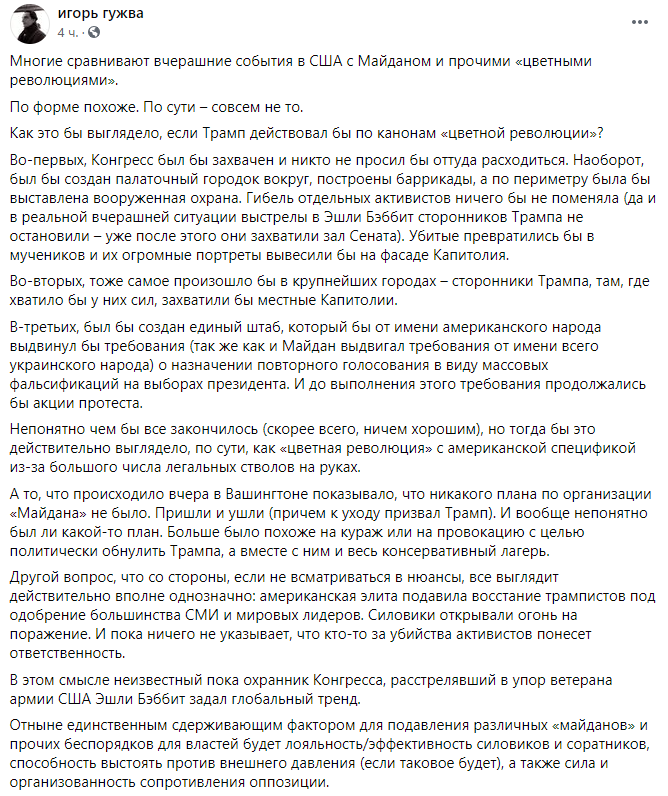 "Многие сравнивают вчерашние события в США с Майданом и прочими "цветными революциями".