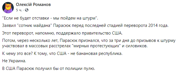 К чему это все? К тому, что США - не банановая республика. Не Украина. В США Парасюк получил бы от полиции пулю", - пишет журналист Алексей Романов.
