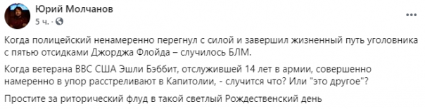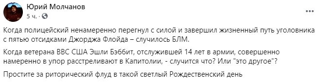 Когда ветерана ВВС США Эшли Бэббит, отслужившей 14 лет в армии, совершенно намеренно в упор расстреливают в Капитолии, - случится что? Или "это другое"?", - пишет обозреватель Юрий Молчанов.