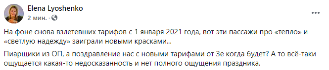 Пиарщики из ОП, а поздравление нас с новыми тарифами от Зе когда будет? А то всё-таки ощущается какая-то недосказанность и нет полного ощущения праздника", - пишет адвокат Елена Лёшенко.