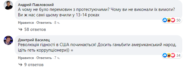 В Украине обсуждения этого феномена пошли двумя путями - промайдановский лагерь и примкнувший к нему Зеленский поддержали разгон протестов. Другие комментаторы заявили, что это нелогично - у себя культивировать "революции", а в Штатах восхвалять их подавление.