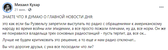 "Это как если бы Рузвельту запретили выступать по радио с обращениями к американскому народу во время войны или эпидемии, а все просто пожали плечами, ну да, все норм. Он же не понравился владельцам трех основных радиостанций - пусть терпит, да, все ок...