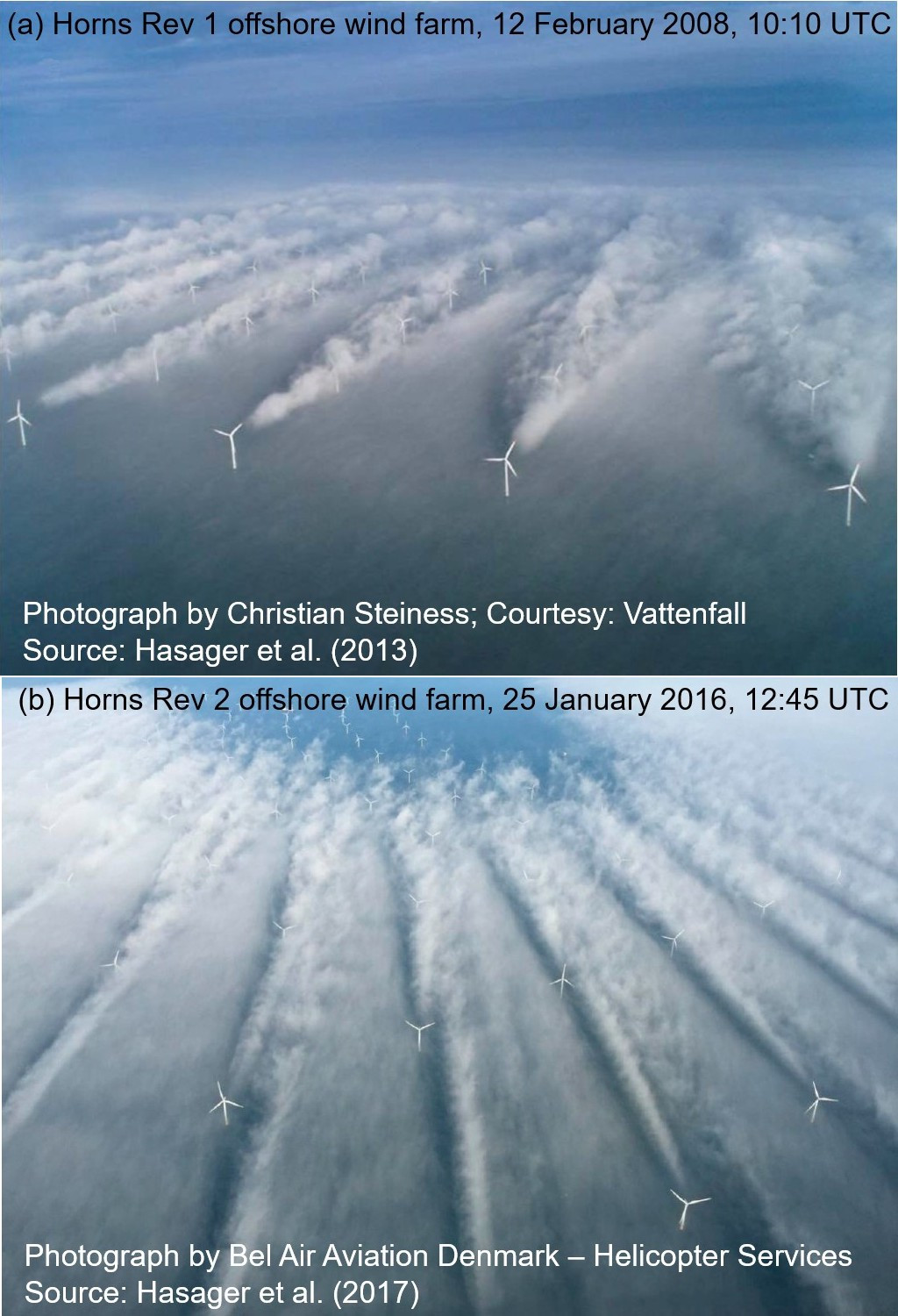 Фотографии демонстрируют два различных вида «влияния попутного потока» в ветропарках рядом с побережьями Дании. (a) Фотография Кристиана Стейнесса демонстрирует влияние холодного влажного воздуха, проходящего над более тёплой поверхностью моря (2013 год). (b) Фотография Bel Air Aviation Denmark — Helicopter Services демонстрирует влияние тёплого влажного воздуха, проходящего по более холодной поверхности моря (2017 год).