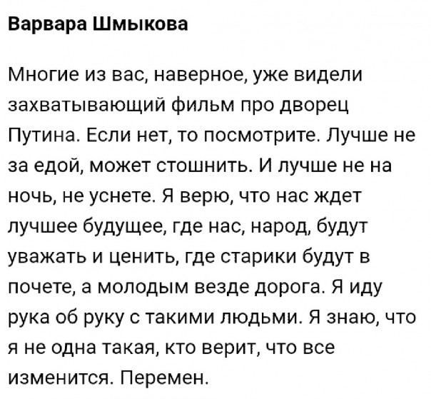 "Захватывающий фильм" я смотрел. Почему эти все люди не включают критическое мышление? Может я слишком многого хочу и у нашей богемы этого качества априори нет? Не углубляясь глубока скажу что "Дворец для Путина" - это боян и развесистая клюква.