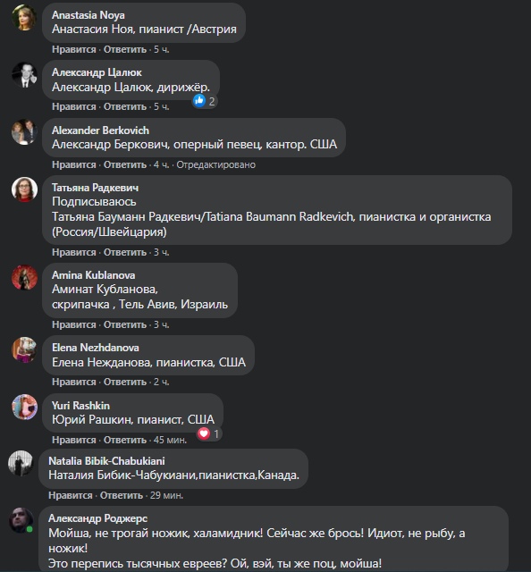 И в подписантах данного письма почти исключительно пианисты и скрипачи из Германии, США, Канады и Израиля. Русских практически нет.