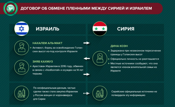 На этой неделе власти двух государств при посредничестве со стороны РФ договорились об обмене содержащихся в израильских тюрьмах сирийцев Нахалема аль-Макта и Зияба Кахмуза на одну гражданку Израиля.