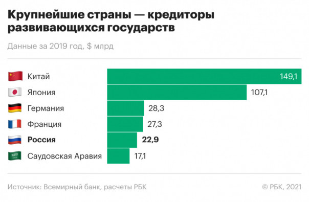 Россия занимает пятое место в списке крупнейших суверенных кредиторов для развивающихся стран, следует из данных Всемирного банка, которые собрал экономист американского Института управления природными ресурсами (NRGI) Дэвид Михалый. Лидирует Китай, прокредитовавший развивающихся заемщиков на $149 млрд.