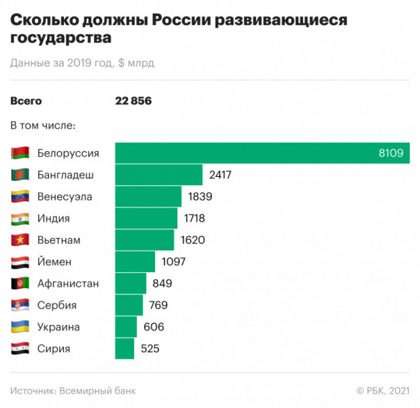 Крупнейшим государственным должником России является Белоруссия — $8,1 млрд на конец 2019 года (сумма совпадает с той, которую Минфин Белоруссии раскрывал в проспекте своих еврооблигаций в июне 2020 года). В конце 2020 года страны подписали межправительственное соглашение о предоставлении Минску еще $1 млрд от России.