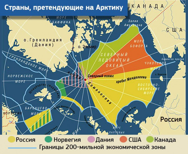 Международного договора, определяющего правой статус Арктики, в настоящее время не существует. Правовой статус региона регулируется нормами международного права, национальным законодательством арктических государств и двусторонними соглашениями. Ранее, в середине 1920-х гг., Арктика была поделена на пять секторов ответственности между США, Россией, Норвегией, Канадой и Данией. В 1982 г. была принята Конвенция ООН по морскому праву, согласно которой территория государства включает шельф, тогда как внешельфовая зона объявляется международной. Статья 76 Конвенции автоматически устанавливает границы шельфа в 200 морских миль, но предоставляет государству право претендовать на шельф, простирающийся за эту границу. В любом случае Россия является страной, которая обладает самой большой долей арктических богатств. Над этими богатствами США и рассчитывают установить своё господство.