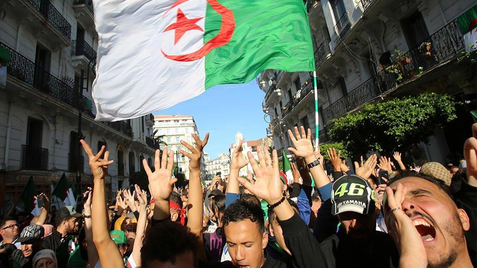 Демонстранты несут национальные флаги во время акции протеста против правящей элиты страны в годовщину революции 1954 года против французского колониального господства в Алжире