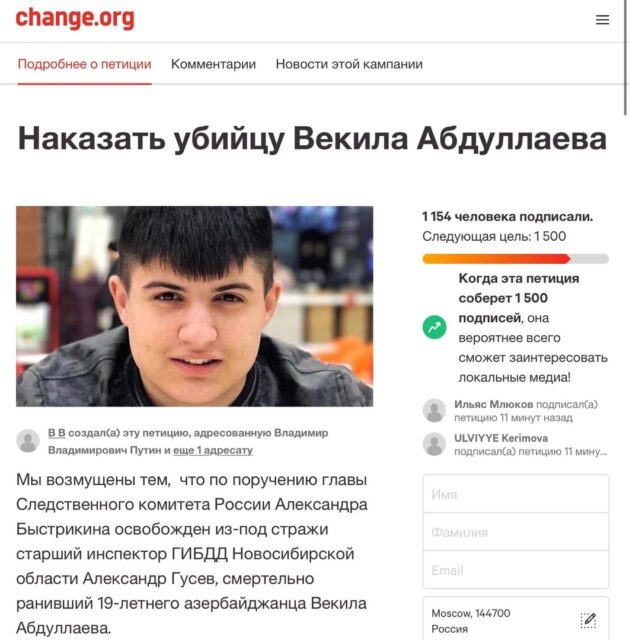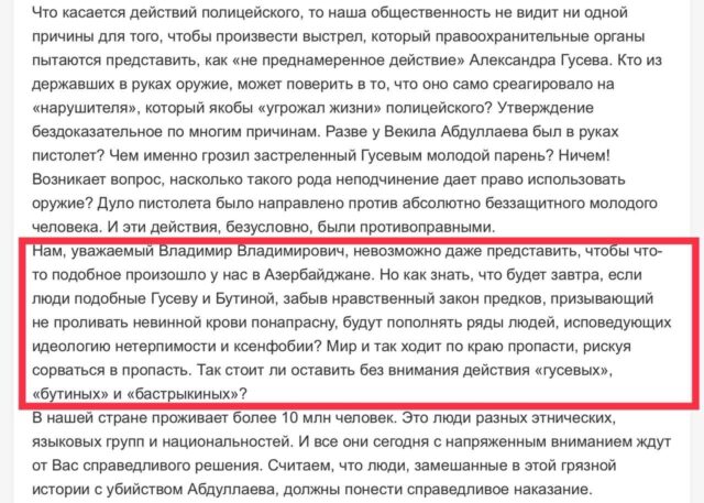 Общественность России глубоко возмущена тем фактом, что азербайджанская диаспора при поддержке опполиберальных сил, чья деятельность направлена на дестабилизацию ситуации в России, делает все для того, чтобы гибель Векила Абдуллаева, оказавшего сопротивление при задержании правоохранительными органами РФ, приобрела политизированный характер.