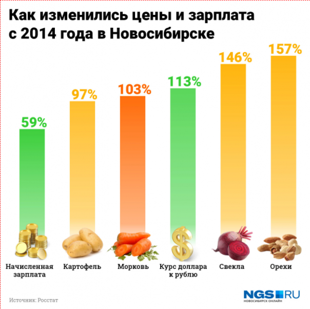 Курс доллара к рублю (от которого зависит не только импорт, но и потенциально экспортные товары тоже) за это время подскочил на 114%. Другими словами, если в июле 2014 года на среднюю зарплату в Новосибирской области можно было купить 802 килограмма моркови, то сейчас — от силы 540 (и то, если поискать).