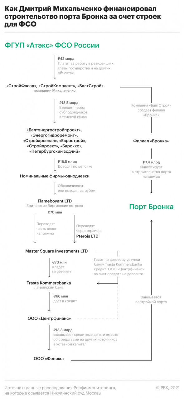 Со ссылкой на выводы Росфинмониторинга в решении описывается схема, по которой доходы от строек ФСО могли идти на строительство Бронки.