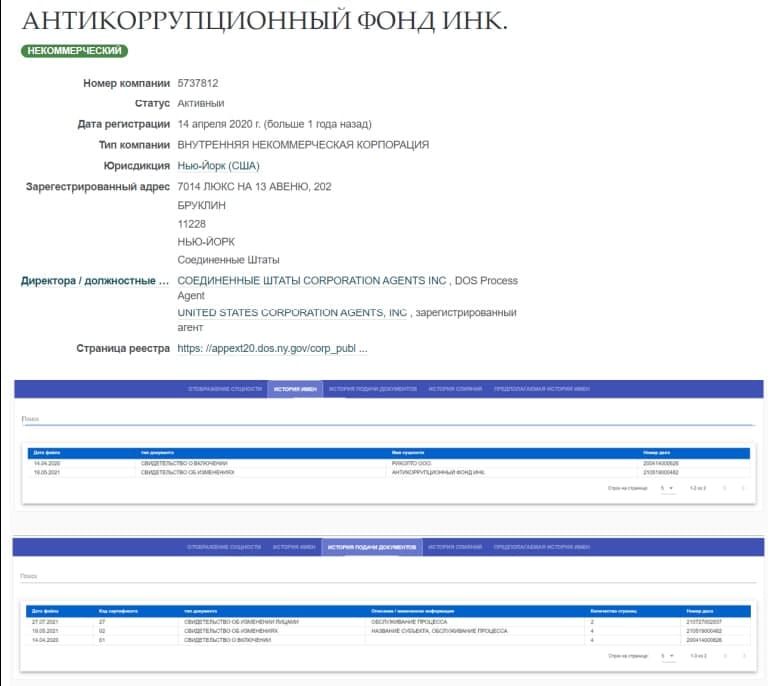 Без труда находим это юрлицо в американской корпоративной базе - зарегистрировано 14.04.2020 в США под названием RIKOLTO LTD (регистрация в Бруклине, Нью-Йорк. 19.05.2021 юрлицо было переименовано в Anti-Corruption Foundation Inc.