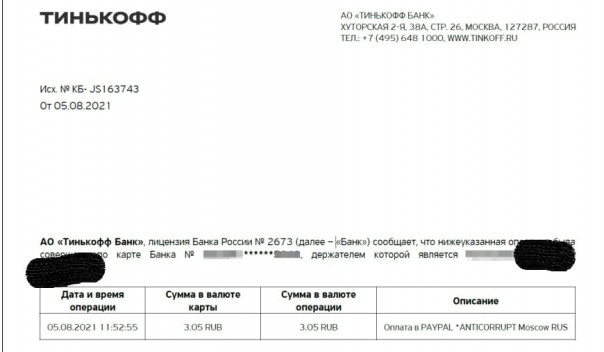 При переводе средств с кошелька PayPal в данных о платеже вылезает юридическое лицо Anti-Corruption Foundation Inc. (Антикоррупционный Фонд Инкорпорейтед).