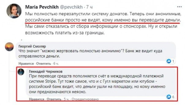 Как утверждает Леонид Волков и Певчих, ни жертвователей, ни компанию собирающую донаты, нельзя отследить, поскольку только компании-посреднику Stripe известно, откуда и куда перечисляются деньги. Наивные жертвователи уже понесли свои денежки.