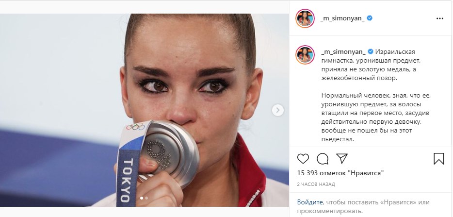 «Израильская гимнастка, уронившая предмет, приняла не золотую медаль, а железобетонный позор. Нормальный человек, зная, что ее, уронившую предмет, за волосы втащили на первое место, засудив действительно первую девочку, вообще не пошел бы на этот пьедестал. Какие же космические твари! Я больше не смотрю Олимпиаду. Никакую. Тьфу».Маргарита Симоньян