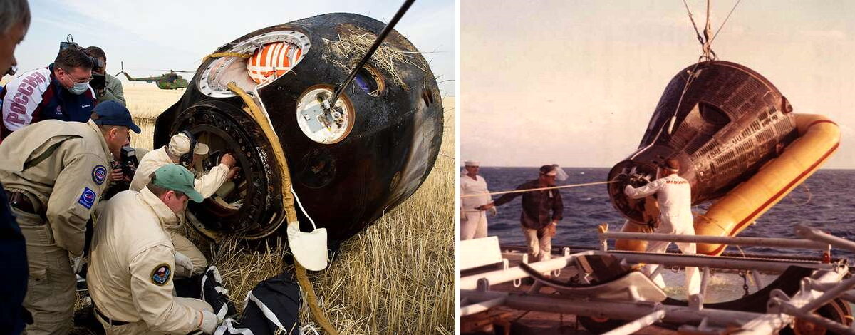 А вот Джемени 7 пробывшая в космосе 14 суток. Ребята после посадки обнимаются и ходят сами. А представьте, сколько отходов за полмесяца накопилось в их скафандрах-памперсах?