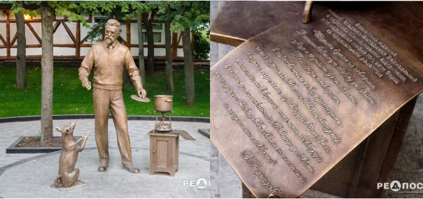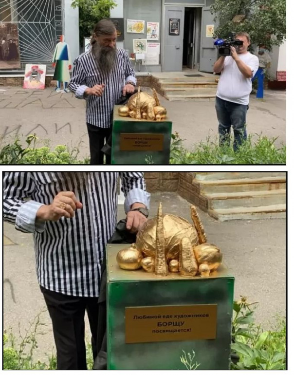 При этом художник и автор проекта подчеркнул, что специально воссоздал ингредиенты в виде золота, чтобы подчеркнуть ценность самого блюда. «Любимой еде художников борщу посвящается!» – написано на постаменте.
