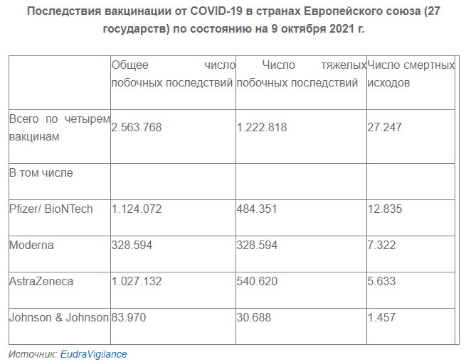 Во-вторых, стало возникать много побочных последствий вакцинации, вплоть до смертельных исходов. В ЕС действует информационная система EudraVigilance, которая фиксирует подобные случаи. Даже официальные данные впечатляют:
