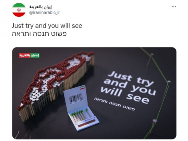 На нем Израиль выложен спичками и гвоздями. Рядом лежит коробок спичек с флагом Ирана. Текст, написанный рядом на английском языке и иврите, гласит: "Просто попробуйте, и вы увидите". Источник