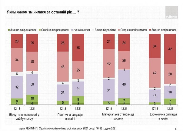 Да, как видим, в сравнении с последним годом правления Порошенко, падение уровня жизни при Зеленском хотя и продолжается, но в целом как будто бы чуть снизилось. Однако это кажущееся улучшение. Ведь существенно выросли «крайне негативные» (говоря языком социологов) оценки положения.