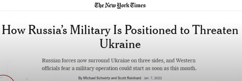Выше, вы можете увидеть разработанную и опубликованную карту «окружения» российскими войсками Украины от The New York Times. Ниже заголовок под которым была она опубликована.