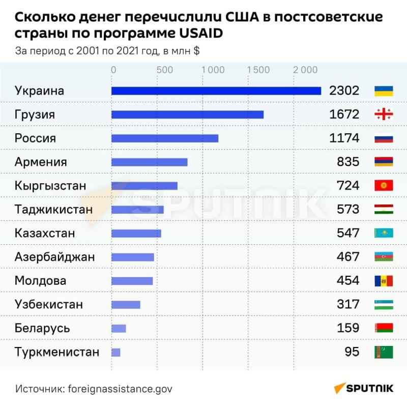 Из выделенных USAID (Агентство США по международному развитию, через которое выделяются деньги в виде помощи для развивающихся стран) за последние 20 лет $9,3 млрд дотаций для стран бывшего СССР Украина получила 2,3 миллиардов долларов.