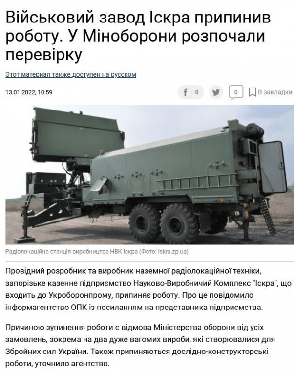 Также есть мнение, что, случись наступление, русские будут применять высокотехнологическое оружие, ракеты и авиацию против которых у ВСУ нет НИЧЕГО. Здесь не будет лишним напомнить, что стараниями властей прекратило работу запорожское казённое предприятие НПК «Искра» – единственный разработчик и производитель радиолокационной техники, а с тактической авиацией у Украины полный швах.