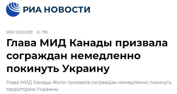 "Пока мы продолжаем тесно взаимодействовать с нашими партнерами и отслеживать ситуацию, я призываю всех канадцев на Украине принять необходимые меры и покинуть страну сейчас же", — сообщил министр иностранных дел Канады Мелани Жоли.