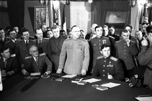 Фото: советская делегация принимает Акт о капитуляции нацистской Германии, май 1945 г.