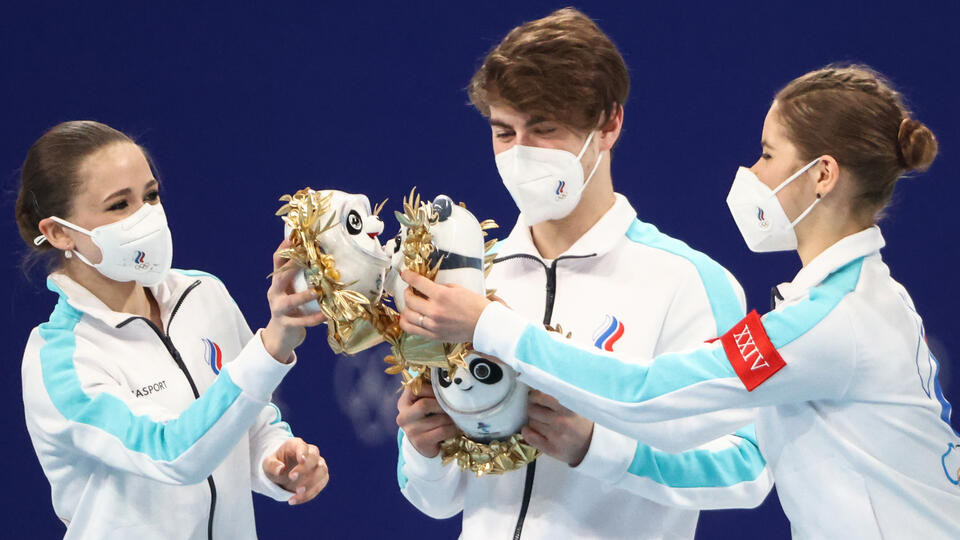 Командные соревнования. Камила Валиева, Марк Кондратюк и Анастасия Мишина (ОКР) (слева направо) - золотые медали, на цветочной церемонии