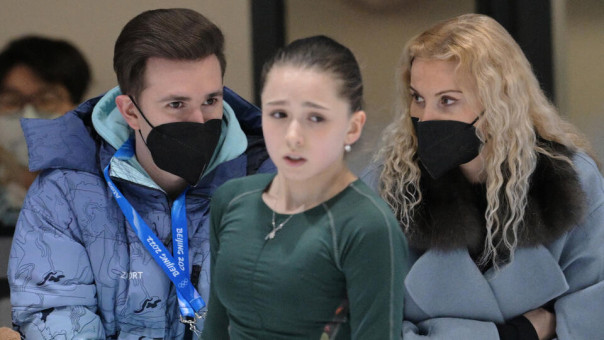 Российская спортсменка, член сборной России (команда ОКР) Камила Валиева и ее тренеры Этери Тутберидзе и Даниил Глейхенгауз во время тренировки спортсменки перед соревнованиями по фигурному катанию на личное первенство на XXIV зимних Олимпийских играх в Пекине