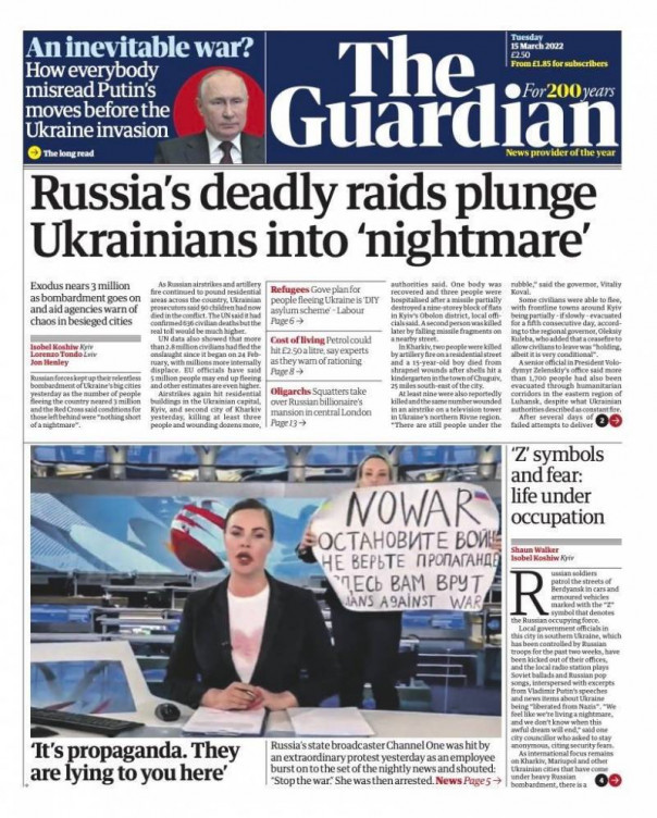 Основной целью Овсянниковой была провокация массового протеста, недаром, она в ролике, предваряющем акцию, упомянула «невинного» Навального. Провокационный поступок хрупкой женщины должен быть истолкован публикой как призыв к выходу на улицу. Если уж Овсянникова решилась на такое, то и ты не стой в стороне. Посыл вполне понятен и не единожды встречался в истории. Но была и еще одна мысль на плакате – перевод фраз на английский язык «No war. Against war». Марина в этом случае обращается не к россиянам, а к иностранным зрителям, пытается уверить платежеспособную публику на западе, что она своя. Не хватает только фразы «Верните обратно IPhone и McDonalds».