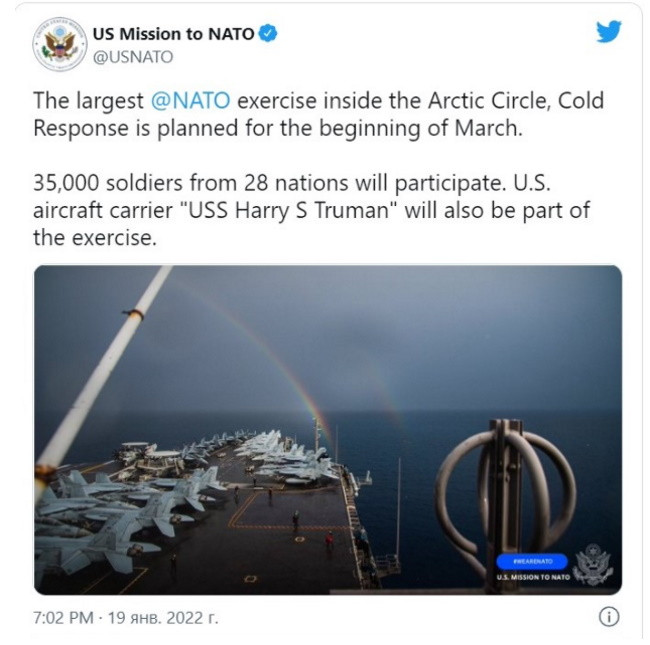 Сегодня уже совершенно ясно, что американский атомный авианосец «Гарри Трумэн» в Норвежское море не отправится и участвовать в проходящих там крупнейших военных учениях НАТО Cold Response – 2022 не будет. Потому что до конца этих учений осталось чуть больше недели, и «Трумэн» уже никуда не успеет. Хотя в январе об этих планах объявлялось широко.