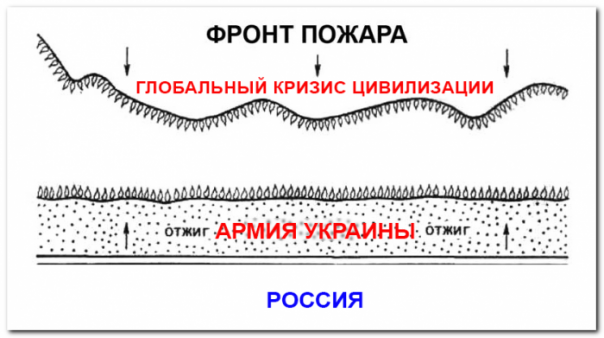 Т.е. в метафоре «встречного пала» Россия превращает армию Украины в такую вот «полоску выжженной земли», через которую огонь основного пожара не сможет перейти. Ну а повторно поджечь уже выжженный участок — невозможно. Надо подождать как минимум год чтобы там выросла трава, отцвела и успела засохнуть. Вот так выгладит военная сторона операции «встречный пал».