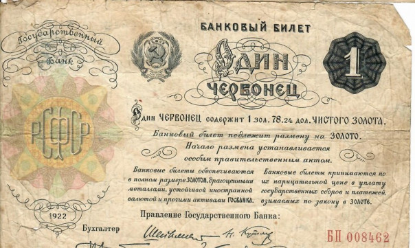 Приняли решение именовать новую валюту «червонцем». Название происходит от словосочетания «червонное золото» – старинного названия высокопробного вида золота. 22 ноября того же года был начат выпуск банковых билетов Государственного банка РСФСР в червонцах. В конце 1922 года в обращение поступили первые банкноты достоинством в 5 и 10 червонцев. Купюры в 1, 3 и 25 червонцев были пущены в оборот позднее, к лету 1923 года. Предусмотренные декретом банкноты в 2 и 50 червонцев так и не появились на свет.