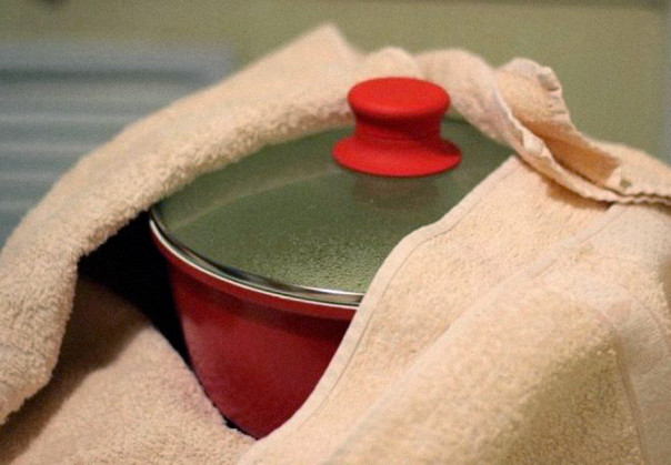 В СССР, даже в позднем, микроволновки были большой редкостью, поэтому женщины, приготовившие ужин загодя, старались сохранить его тёплым. Для этого они укутывали кастрюли в шерстяное одеяло, в полотенце или за неимением другого даже в тёплый свитер. Конечно, еда постепенно остывала, но всё же происходило это не так быстро. А какая экономия электроэнергии! Европейцы должны оценить такой способ.