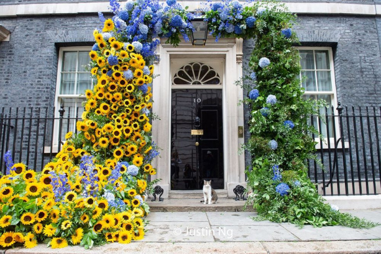 На заглавном фото: в честь незалежности Украины резиденцию премьер-министра Великобритании украсили синими и жёлтыми цветами. А британцы всё чаще указывают украинцам на дверь…