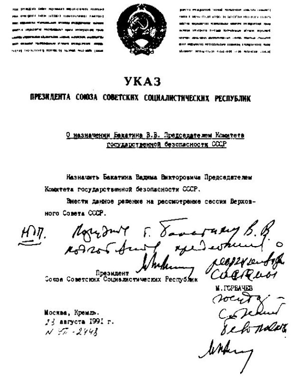 23 августа президент СССР М.С. Горбачёв по согласованию с президентом РСФСР Б.Н. Ельциным подписал указ о назначении Бакатина на должность председателя КГБ СССР.