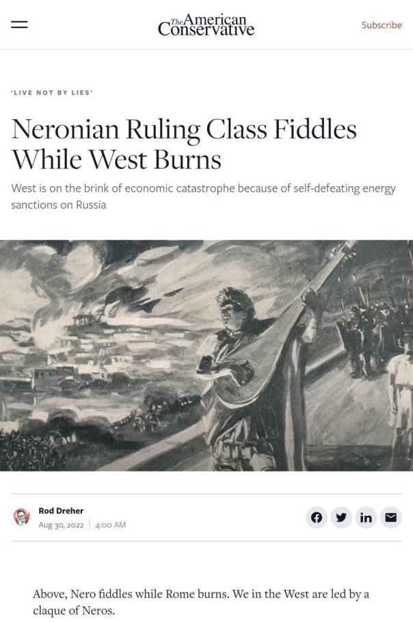 Запад находится на грани экономической катастрофы из-за заведомо обреченных на провал санкций против России, не сомневается американский журнал The American Conservative. Мало того, издание считает, что во главе коллективного Запада стоит кучка современных «неронов» (издание напоминает: Нерон – римский император, который сжёг Рим), готовых принести в жертву как минимум Европу. И как бы кому ни нравилось, но Запад не сможет победить в противостоянии с Россией и не может даже позволить себе продолжать это противостояние, которое грозит закончиться для Запада весьма печально.
