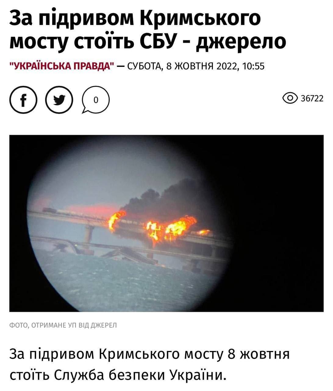 За подрывом Крымского моста стоит СБУ, сообщает издание «Украинская правда»