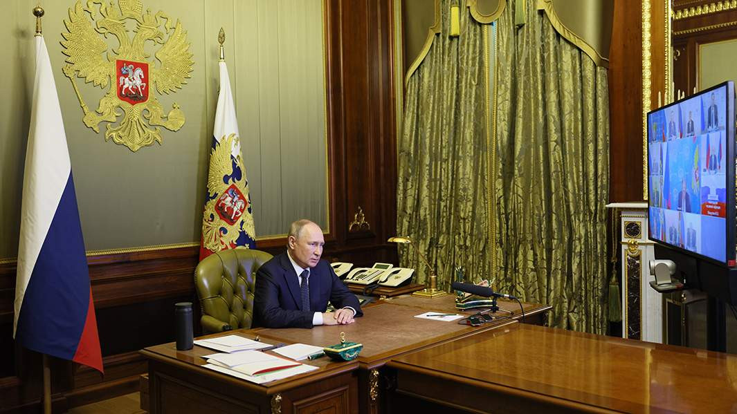 Президент РФ Владимир Путин проводит оперативное совещание с постоянными членами Совета безопасности РФ в режиме видеоконференции