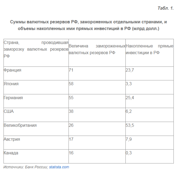 Как видим, компенсировать убытки, понесенные планируемой конфискацией валютных резервов России, за счет встречной конфискации накопленных прямых инвестиций тех же самых стран не получится. Япония, например, заморозила и может конфисковать валютные резервы РФ, которые превышают ее накопленные прямые инвестиции в России в 17,6 раза. У других стран подобное превышение составляет (раз): Франция – 3,0; Германия – 2,2; США – 6,1; Австрия – 2,2; Канада – 53,3. Лишь одна страна коллективного Запада может оказаться в проигрышном положении. Это Великобритания. Накопленные прямые инвестиции этой страны в РФ в два с лишним раза превышают величину тех валютных активов РФ, которые Великобритания заморозила и готовится конфисковать.